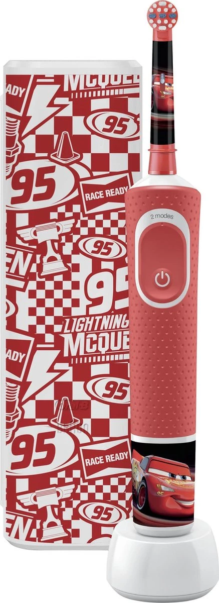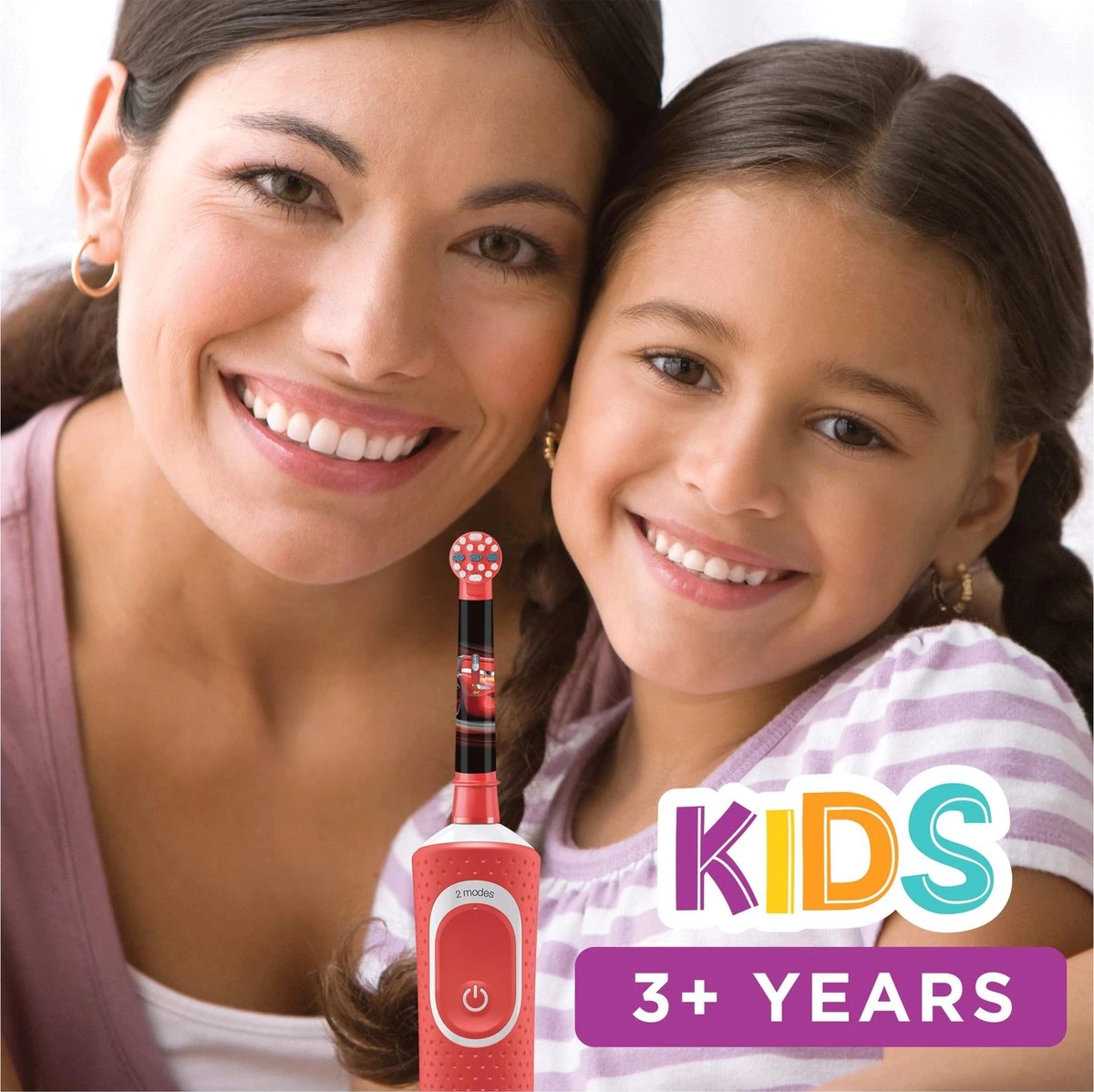 Met de Oral-B Kids elektrische tandenborstel voor kinderen vanaf 3 jaar kunnen kinderen plezier beleven aan Disney Pixar Cars én profiteren van de milde, effectieve reiniging van een door tandartsen aanbevolen tandenborstel van Oral-B. Met een unieke, kindvriendelijke gevoelige modus reinigt deze borstel de tanden van kinderen voorzichtig. Hij verwijdert meer tandplak dan een gewone manuele tandenborstel. Er zitten vier leuke Disney Pixar Cars-stickers bij om het handvat mooier te maken..