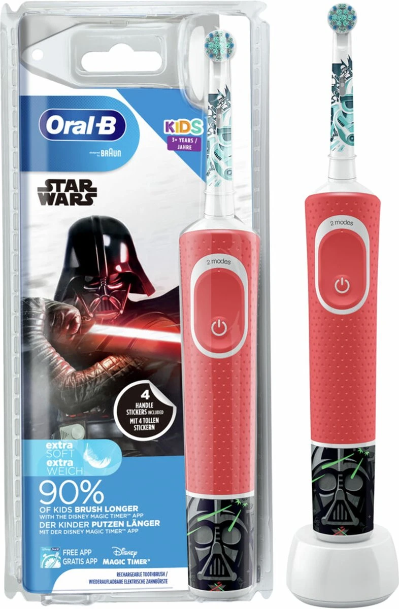 Met de Oral-B Kids elektrische tandenborstel voor kinderen vanaf 3 jaar kunnen kinderen plezier beleven aan Star Wars én profiteren van de milde, effectieve reiniging van een door tandartsen aanbevolen tandenborstel Oral-B. Met een unieke, kindvriendelijke gevoelige modus reinigt deze borstel de tanden van kinderen voorzichtig. Hij verwijdert meer tandplak dan een gewone manuele tandenborstel. Er zitten vier leuke Star Wars-stickers bij om het handvat mooier te maken..
