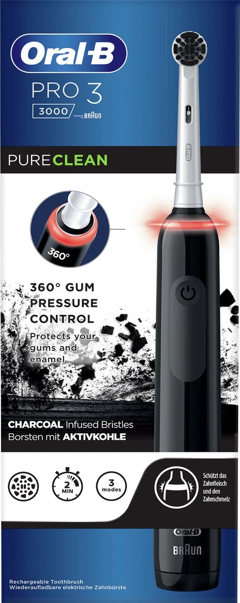 Ervaar de Oral-B Pro 3 van het nummer een meest gebruikte tandborstelmerk door tandartsen wereldwijd. Het slanke handvat van de Pro 3 elektrische tandenborstel helpt u te poetsen zoals uw tandarts dat aanbeveelt: Het helpt u 2 minuten poetsen met de professionele timer en meldt u om de 30 seconden dat u een andere zone moet poetsen. U beweegt de borstel gewoon in uw mond en de unieke, ronde borstelkop van Oral-B doet de rest. Dankzij borstelharen met houtskool reinigt deze 100% meer tandplak dan een gewone manuele tandenborstel. Dat is niet alles, de tandenborstel helpt u ook uw gevoelige tandvlees te beschermen met de poetsdrukcontrole die de poetssnelheid vermindert en u waarschuwt als u te hard poetst. De Oral-B Pro 3 tandenborstel is onmisbaar voor iedereen die naar een elektrische tandenborstel wil overschakelen en zijn mondgezondheid wil verbeteren.