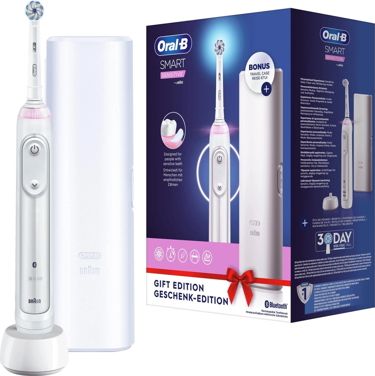 De Oral-B Smart Sensitive elektrische tandenborstel is speciaal ontwikkeld voor mensen met gevoelige tanden. Het gevoelige programma, samen met de visuele tandvleesdrukregeling, beschermt uw gevoelige tandvlees en zorgt voor een bijzonder zachte reiniging met de Sensitive Clean borstelkop. De ultradunne borstelharen zijn sterk tegen tandplak en zacht voor het tandvlees. Hij maakt naadloos verbinding met de Oral-B app op uw telefoon en begeleidt u met realtime feedback om beter te poetsen. De geïntegreerde timer herinnert u aan de poetstijd van 2 minuten die wordt aanbevolen door tandartsen en de lithium-ion-batterij gaat langer dan 2 weken mee.